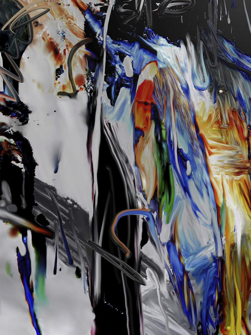The memory of a former shape unfolds the liquid matter and stretches it within its own fluid consciousness, coagulating broad gestures that open the senses of color toward a living breath. The pigments transform into lucid, electric energy; each trace becomes the attempt of a matter that relearns and reshapes itself, breaking through the pressure of stillness. Light, carried by metallic neon gleams, disturbs the organic obscurity: everything flows, unravels, and recomposes on the threshold between melting and crystallization, as the rupture reveals the thought of matter.